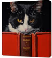 Obraz z serii wnętrza zatytułowany Koci Uczeń. Prezentuje on uroczego, czarno-białego kota z intensywnie żółtymi oczami, zaglądającego ciekawie do czerwonej, otwartej książki. Głęboki czarny tło podkreśla barwy i szczegółowe detale futra kota, a także złocenia na grzbiecie książki. Ten obraz łączy w sobie humor i ciepło, doskonale oddając osobowość i charakter kotów jako towarzyszy domowych. Idealny do umieszczenia w domowych bibliotekach, salonach czy pokojach dziecięcych, plakat ten dodaje wnętrzu przytulności i wprowadza zabawny, intelektualny element.