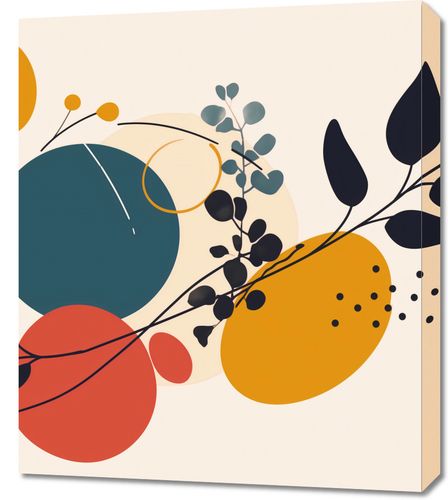 Obraz z serii minimalistyczne zatytułowany Kolaż Przyrody. Grafika ta łączy organiczne kształty i roślinne motywy z geometrycznymi figurami. Prezentuje bogate połączenie kolorów - od głębokiego granatu przez czerwień, musztardowy żółty po delikatne beże. Wyróżnia się przez obecność roślinnych sylwetek na pierwszym planie, które nadają kompozycji naturalnego charakteru.Ten obraz będzie wspaniałym dodatkiem do wnętrz, gdzie panuje spokój i równowaga. Jego stonowana, ale wyrazista kolorystyka sprawi, że będzie doskonałym uzupełnieniem przestrzeni skandynawskich, minimalistycznych, a nawet boho. Wydaje się być idealnym wyborem do salonu, sypialni lub miejsca pracy dla osób ceniących sobie połączenie sztuki i natury, gdzie mógłby stać się centralnym elementem dekoracyjnym.