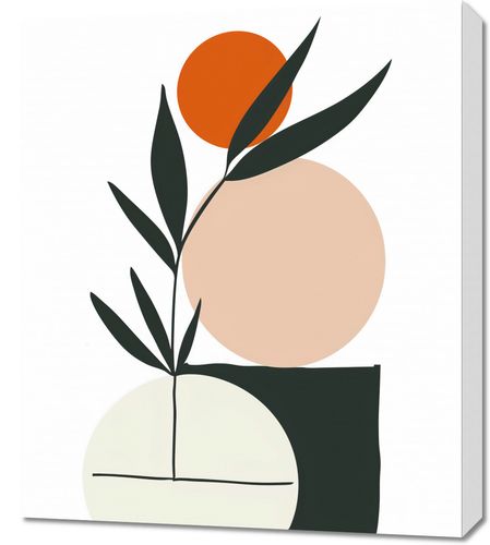 Obraz z serii boho zatytułowany Kompozycja Natury. Grafika łączy proste formy geometryczne z elementami przyrody, tworząc obraz, który jest jednocześnie nowoczesny i organiczny. Zestawienie gładkich, zaokrąglonych kształtów z ostrymi, ciemnymi liśćmi wprowadza wizualne napięcie, a pomarańczowa kula na wierzchołku gałązki przypomina zachodzące słońce lub soczysty owoc. Palecie barw dominują stonowane odcienie, które razem tworzą kojącą i zrelaksowaną atmosferę.Dzieło to doskonale sprawdzi się w przestrzeniach, które aspirują do stworzenia spokojnego i zbalansowanego wnętrza, takich jak jadalnie, poczekalnie lub pokoje relaksacyjne. Może także pełnić funkcję spajającą w pomieszczeniach z elementami zielonymi, takimi jak domowe ogrody zimowe czy salony w stylu eko.