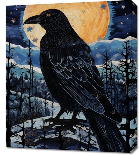 Obraz z serii abstrakcja zatytułowany Kruczy Mąciciel. Ta praca przedstawia majestatycznego kruka, który góruje nad zimowym lasem pod rozgwieżdżonym niebem. Tło, na którym widnieje wielka, pełna księżycowa aureola w złocistych i ciepłych odcieniach, kontrastuje z chłodnymi tonami niebieskiego i czerni, użytych do oddania tajemniczego krajobrazu i ptaka. Kruka cechuje szczegółowe przedstawienie piór, które dodaje tekstury i głębi, a jego silna postać emanuje spokojem i siłą. Obraz ten idealnie pasuje do przestrzeni, które celebrują naturę i jej mityczne aspekty, jak domowe biblioteki, salony w stylu eklektycznym lub pokoje z elementami boho, dodając im charakteru i wyjątkowości.