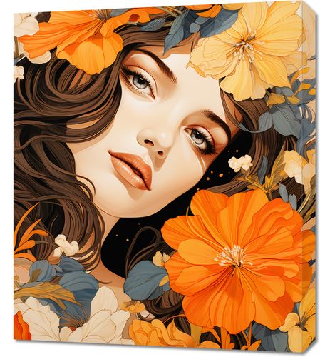 Obraz z serii natura zatytułowany Kwiatowa Esencja. Hipnotyzujące spojrzenie kobiety otoczonej eksplozją jaskrawych kwiatów podkreśla jej głęboką więź z przyrodą. Jej lśniące włosy splatają się z płatkami, a promieniejące oczu odzwierciedlają bogactwo i różnorodność przyrody. Płynące linie i bogate kolory sprawiają, że kompozycja jest niczym zjawiskowy ogród pełen życia i pasji. Wspaniale wpisuje się w wnętrza inspirowane motywami kiatowymi i kawiarniach