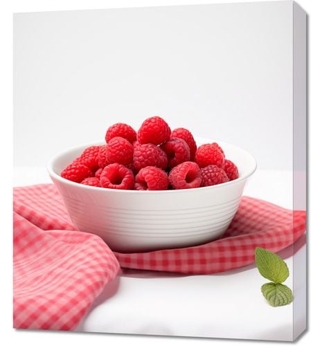 Obraz z serii wnętrza zatytułowany Lato w Misce. Na obrazie widnieje pełna misa soczystych, dojrzałych malin, które kontrastują swoją intensywną czerwienią z czystą bielą naczynia i tłem. Rozłożona obok misy czerwono-biała, kratka serwetka dodaje wiejskiego uroku, a pojedynczy listek mięty wprowadza świeży akcent. Ten obraz przyciąga wzrok swoją prostotą i elegancją, idealnie uchwycając esencję letniego sezonu i świeżości owoców. Doskonały do ożywienia kuchni, jadalni, a także jako element dekoracyjny w przestrzeniach, gdzie chce się wprowadzić nutę świeżości i naturalnego piękna. Zaprasza do celebracji zdrowego stylu życia i radości płynącej z prostych przyjemności.