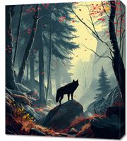 Obraz z serii natura zatytułowany Leśne Echa. Ilustracja przedstawia samotnego wilka stojącego na skale, który wpatruje się w mglistą dal tajemniczego lasu. Złote światło przebijające się przez drzewa nadaje scenie spokojną, ale zarazem majestatyczną atmosferę. Jesienne liście w odcieniach czerwieni kontrastują z chłodnymi tonami otoczenia, podkreślając zmienność sezonów. Obraz ten oddaje uczucie zadumy i połączenia z naturą, będąc idealnym dodatkiem do wnętrz, które cenią sobie spokój i dziką przyrodę, takich jak górskie chaty, saloniki z kominkiem lub przestrzenie wypoczynkowe.