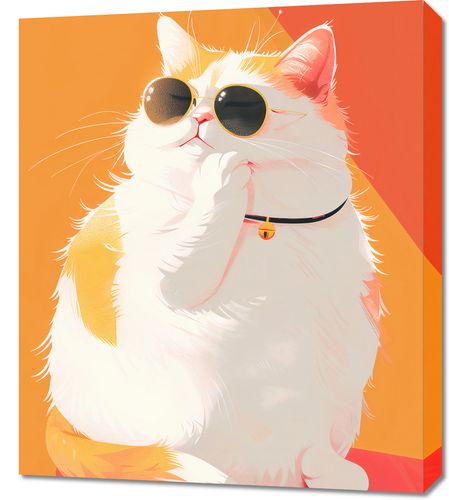 Obraz z serii abstrakcja zatytułowany Lizu Lizu przedstawia zabawnie ludzki portret białego kota w okularach przeciwsłonecznych, który zamyślenie przyciera łapę do pyszczka, jakby zastanawiał się nad życiem. Jego biała, puszysta sierść kontrastuje z tłem w żywych odcieniach pomarańczu, co nadaje kompozycji ciepły i słoneczny charakter. Okulary przeciwsłoneczne dodają kociej postaci nonszalanckiego, relaksującego stylu, a ich refleksy świetlne przyciągają uwagę. Uroczy obrazek jest pełen humoru i stylu, idealny do dodania osobowości i lekkości do każdej przestrzeni, od domowego biura po salon.