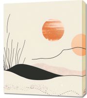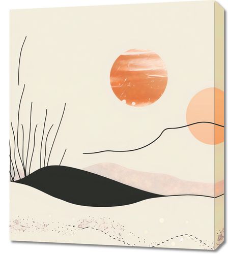 Obraz z serii boho zatytułowany Miękkie Wzgórze. Przedstawia on poetycką interpretację zachodzącego słońca, gdzie delikatne linie roślin wyłaniają się z miękkich, falujących wzgórz. Paleta kolorów to ciepłe odcienie beżu, różu oraz akcenty silniejszego pomarańczu i głębokiej czerni, które razem tworzą kojącą i spokojną atmosferę. Abstrakcyjne słońca o różnych odcieniach i wielkościach dodają kompozycji głębi i perspektywy. Ten obraz doskonale sprawdzi się jako akcent dekoracyjny w przestrzeniach, które mają być miejscem relaksu i odprężenia. Jego spokojna kolorystyka i delikatne linie będą komplementować wnętrza takie jak sypialnie, pokoje medytacyjne, gabinety relaksacyjne lub każde miejsce, które chce celebrować spokój i cichą elegancję.