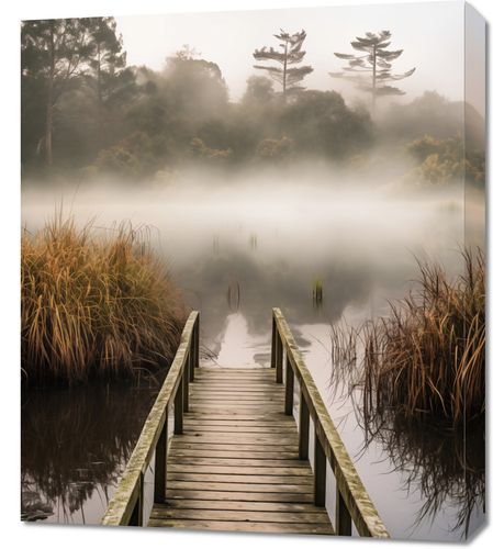 Obraz z serii pejzaże zatytułowany Most do Tajemnicy. Na tym mistycznym obrazie drewniana kładka prowadzi nas ku tajemniczej mgle, która delikatnie spowiła powierzchnię spokojnego stawu. Złote trzciny i zarysy drzew rzucają się w oczy na tle zamglonego poranka, tworząc uczucie ciepła i spokoju. Ten obraz oddaje piękno niewidzialnego świata, który czai się tuż za zasłoną mgły, zachęcając widza do refleksji i odkrywania nieznanego. Idealnie nadaje się do wnętrz, gdzie dominuje natura i spokój, takich jak salony spa, pokoje relaksacyjne, czy prywatne biblioteki. To wyjątkowy element dekoracyjny, który może przynieść element kontemplacji i odprężenia do każdego domu lub przestrzeni publicznej.