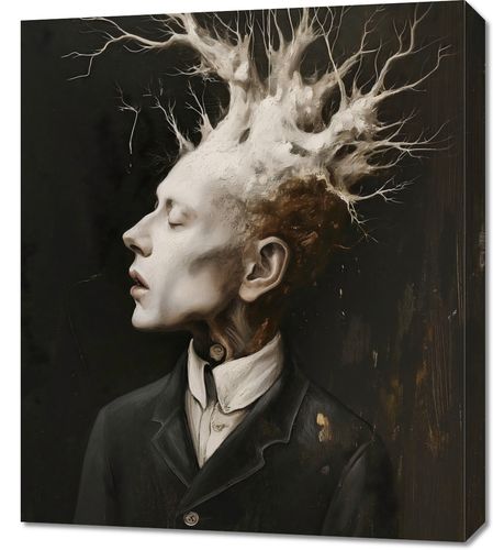 Obraz z serii abstrakcja zatytułowany Myśli Wzrastające prezentuje surrealistyczny portret mężczyzny, z którego głowy wyłania się skomplikowana struktura przypominająca korzenie lub gałęzie drzewa. Ten organiczny koronament wyrasta z myśli postaci, symbolizując rozwój, kreatywność i złożoność ludzkiego umysłu. Kontrast między żywą bielą i szarościami struktury a głębokim, ciemnym tłem sugeruje głębię i intensywność wewnętrznego świata postaci. Ten obraz może stanowić mocny wizualny akcent w przestrzeniach takich jak galerie, artystyczne pracownie, gabinety psychologiczne, a także we wnętrzach osób ceniących głębokie, filozoficzne refleksje.
