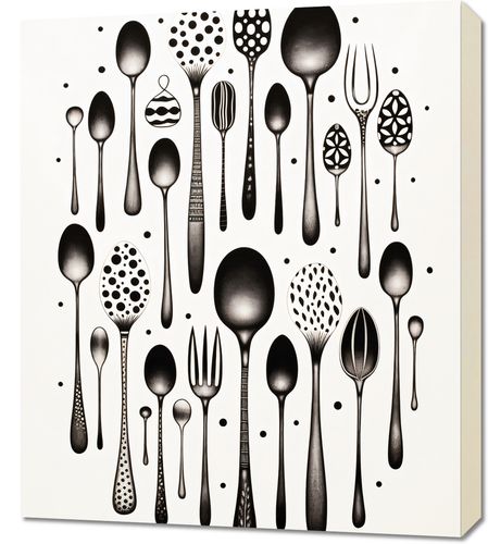Obraz z serii wnętrza zatytułowany Narzędzia Smaku. Eleganckie sylwetki sztućców w różnorodnych kształtach i wzorach, podkreślane przez subtelne detale i geometryczne punkty, tworzą harmonijną i równocześnie zaskakującą kompozycję. Czarne i białe tony nadają prostotę i wyrafinowanie, podczas gdy unikalne projekty sztućców dodają nuty kreatywności i innowacji. Idealnie sprawdzi się w nowoczesnych kuchniach, restauracjach o minimalistycznym designie oraz w przestrzeniach dedykowanych sztuce kulinarnej.