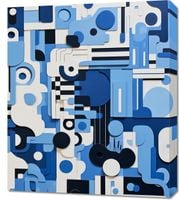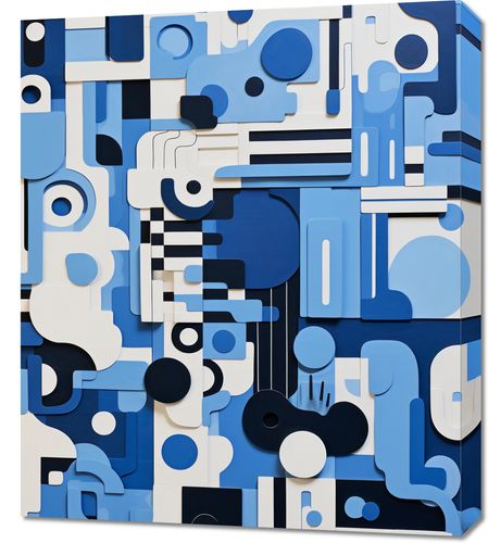 Obraz z serii geometria zatytułowany Niebieski Labirynt. Złożona mozaika geometrycznych kształtów i różnorodnych tekstur w odcieniach niebieskiego i bieli układa się w fascynującą kompozycję przypominającą miasto z lotu ptaka. Kontrasty głębokich granatów z pastelowymi błękitami oraz gładkimi i wypukłymi powierzchniami dodają głębi i trójwymiarowości temu dziełu. Świetnie sprawdzi się w nowoczesnych biurach, przestrzeniach designerskich oraz galeriach sztuki współczesnej.