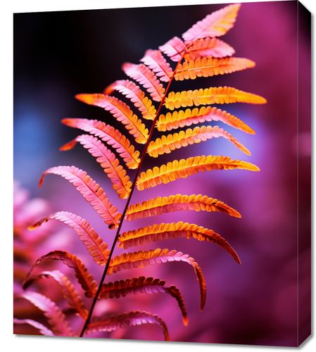 Obraz z serii natura zatytułowany Ogień Jesieni przedstawia pojedynczy liść paproci, który przechodzi przez spektrum ciepłych, jesiennych barw od żółci przez intensywną pomarańcz do głębokiego różu. Kontrastujące, żywe tło w odcieniach purpury podkreśla bogactwo i dynamikę liścia. Delikatne gradacje kolorów oraz wyraźna struktura paproci sprawiają, że obraz wydaje się niemal trójwymiarowy. Ta fotografia to idealny element dekoracyjny, który wprowadzi życie i ciepło do każdego wnętrza, nadając mu artystycznego charakteru. Doskonale sprawdzi się jako wyrazisty akcent w nowoczesnym salonie, sypialni lub biurze, szczególnie dla osób ceniących sobie naturę i jej niezwykłą paletę barw.
