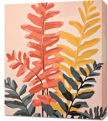 Obraz z serii wnętrza zatytułowany Paleta Natury. Zmysłowa gra kolorów liści, od delikatnych odcieni różu, przez intensywną czerwień, aż po złociste żółcie, kreuje uczucie ciepłego lata przenikającego do wnętrza domu. Delikatność i jednocześnie wyrazistość kształtów liści dodają kompozycji głębi i elegancji. Pastelowe tło harmonizuje z barwami roślin, tworząc spójną i relaksującą całość. Ten obraz doskonale odnajdzie się w modnych salonach, w przestrzeniach wellness, czy też w kawiarniach o nastrojowym, botanicznym klimacie, gdzie natura spotyka się ze sztuką.