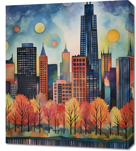Obraz z serii abstrakcja zatytułowany Panorama Malowniczego Miasta. Ta barwna ilustracja łączy w sobie elementy miejskiej architektury z naturalnym pięknem jesiennej przyrody. Pejzaż miejski z dominującymi wysokimi budynkami kontrastuje z pierwszym planem, na którym widnieją drzewa z liśćmi w odcieniach czerwieni i pomarańczy, co przypomina o cyklicznych zmianach w przyrodzie. Tło z abstrakcyjnie przedstawionym nocnym niebem, rozświetlonym przez delikatne światła i fantastyczne planety, nadaje scenie oniryczny i spokojny charakter. Obraz ten jest idealnym dodatkiem do wnętrz, które pragną połączyć urbanistyczną nowoczesność z łagodzącym wpływem natury.
