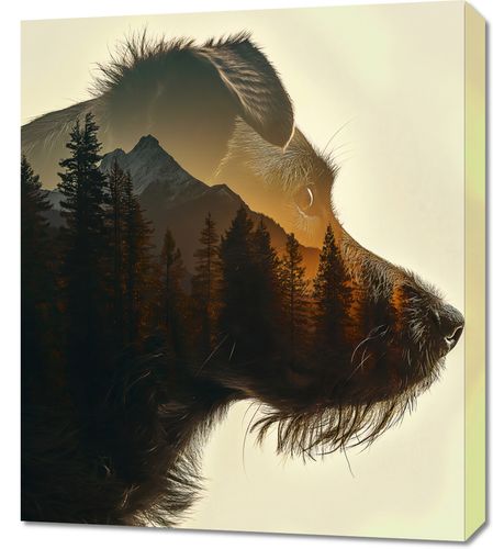 Obraz z serii natura zatytułowany Psi Duch Lasu ukazuje zjawiskowe połączenie sylwetki psa z krajobrazem górskim. Pięknie uchwycony profil psa, z jego czujnym spojrzeniem i delikatnymi liniami twarzy, płynnie przechodzi w malownicze góry, które wyłaniają się z jego sylwetki. Drzewa sosnowe i złociste światło zachodzącego słońca tworzą tło, które emanuje spokojem i harmonią. Kontur psa jest wyraźnie zarysowany, a jednocześnie subtelnie stapia się z przyrodą, co podkreśla nierozerwalną więź między zwierzętami a ich naturalnym środowiskiem. Ten obraz idealnie wpasuje się w wnętrza inspirowane naturą, w salonach miłośników zwierząt lub jako dekoracja w weterynaryjnych poczekalniach, przypominając o pięknie i sile natury oraz naszej odpowiedzialności za jej ochronę.