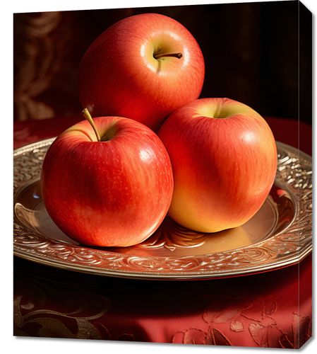 Obraz z serii natura zatytułowany Rubinowe Ekscesy. Trzy soczyste jabłka o lśniącej rubinowej skórce, delikatnie ułożone na antycznym srebrnym talerzu o bogato zdobionych brzegach. Każde jabłko jest uchwycone w pełni swojego naturalnego piękna, z delikatnymi refleksami światła podkreślającymi ich świeżość i kuszący wygląd. Tło z głębokim czerwonym brokatem, dodaje głębi i luksusu kompozycji. Obraz idealnie komponuje się w przestrzeniach kulinarnych, takich jak restauracje wysokiej klasy czy domowe kuchnie, gdzie podkreśla znaczenie estetyki w prezentacji potraw.