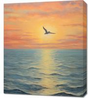 Obraz z serii pejzaże zatytułowany Serenada Nieba. Ten olśniewający obraz przedstawia moment, gdy ostatnie promienie dnia malują niebo w odcienie pomarańczy i różu, a pojedynczy ptak szybuje w stronę zachodzącego słońca. Morze rozciąga się aż po horyzont, odbijając złote światło, które nadaje scenie poczucie nieskończoności i spokoju. Doskonale nadaje się do wnętrz, które aspirują do stworzenia atmosfery spokoju i refleksji, takich jak salony, pokoje wypoczynkowe, czy przestrzenie wellness i spa.