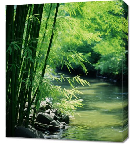 Obraz z serii natura zatytułowany Spokój Bambusów. Ukazuje on idylliczny zakątek przyrody, gdzie zielone pędy bambusa delikatnie zginają się nad błogim, spokojnie płynącym strumieniem. Gra światła i cienia na liściach bambusa tworzy wrażenie głębi i spokoju, zaś szemrząca woda dodaje uczucie świeżości i czystości. Ten obraz oddaje piękno i spokój odosobnionego zakątka natury, jest więc idealny dla przestrzeni relaksacyjnych takich jak spa, pokoje do medytacji lub jako ukojenie w zgiełku codzienności w domowych wnętrzach. To doskonała dekoracja dla tych, którzy pragną wprowadzić element natury i harmonii do swojego otoczenia.