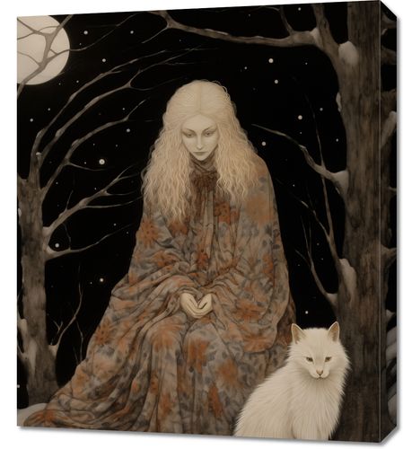 Obraz z serii wnętrza zatytułowany Stróżka Leśna. Ta eteryczna praca artystyczna ukazuje postać kobiecą, owiniętą w szatę z motywem leśnym, zatopioną w kontemplacji pod gałęziami drzew oplecionych przez śnieg i w blasku pełnego księżyca. Jej spokojna obecność i blady odcień skóry kontrastują z ciemnością nocy, a towarzyszący jej biały wilk dodaje elementu dzikości i tajemniczości. Obraz oddaje uczucie spokoju i jedności z naturą, a jednocześnie wzbudza ciekawość dotyczącą ukrytych opowieści i starych legend. Idealny dla miłośników fantastyki, mitologii, oraz tych, którzy pragną wprowadzić do swojego wnętrza elementy oniryczne i magiczne.