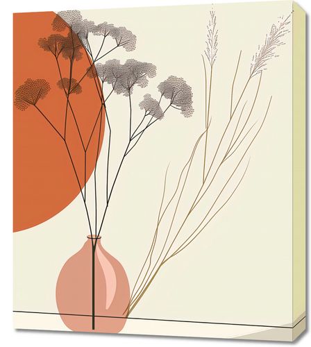 Obraz z serii boho zatytułowany Suszony Widok. Obraz ukazuje zgeometryzowane, stylizowane kwiaty suszonych roślin w wazonie na tle dużego, okrągłego słońca w ciepłych odcieniach pomarańczy i beżu. Kompozycja, w której dominują spokojne, jesiennie nastroje, łączy prostotę formy z bogactwem faktury. Obraz ten doskonale odnajdzie się w wnętrzach o prostym, lecz eleganckim wystroju, takich jak minimalistyczne salony, jadalnie czy hol. Idealnie wpasuje się w otoczenie zarówno nowoczesne, jak i te z nutą retro, wprowadzając ciepło i artystyczną, subtelność.