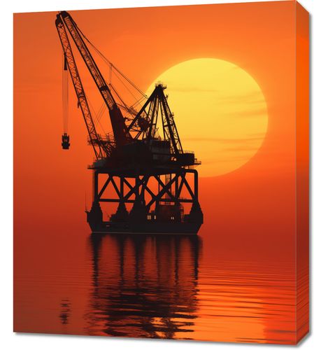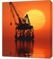 Obraz z serii pejzaże zatytułowany Sylwetka Przemysłu. Ten dramatyczny obraz przedstawia potężną dźwig morski wyłaniający się z tafli wody, zarysowany na tle zachodzącego słońca. Intensywne czerwienie i pomarańcze nieba odbijają się w wodzie, tworząc złudzenie spokojnego morza płonącego w ognistych barwach. Silny kontrast między ciemną sylwetką a żywym tłem podkreśla majestatyczność i siłę konstrukcji, co czyni ten obraz wyjątkowym dodatkiem do nowoczesnych przestrzeni loftowych, biur technologicznych oraz miejsc, gdzie chce się podkreślić surowe piękno i potęgę przemysłu. Idealny dla miłośników architektury i designu, szukających mocnych, inspirujących akcentów w swoim otoczeniu.