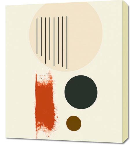 Plakat z serii boho zatytułowany Symetryczna Struna.Grafika przedstawia zrównoważoną kompozycję z surowymi elementami geometrycznymi i organicznym pociągnięciem pędzla. Kremowe tło rozświetla duże koło z rytmicznie rozmieszczonymi pionowymi liniami, które mogą symbolizować struny instrumentu lub elementy urbanistyczne. Intensywne maznięcie koloru w dolnej części obrazu dodaje energii i kontrastu, natomiast umieszczone obok czarne i brązowe kółka wprowadzają wrażenie głębi. Obraz idealnie uzupełni wnętrza w duchu minimalizmu i modernizmu, takie jak stylowe salony, gabinety, czy współczesne przestrzenie biurowe, gdzie może stanowić element kontrastujący z prostotą otoczenia.