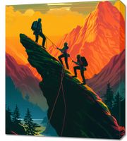 Obraz z serii abstrakcja zatytułowany U Szczytu przedstawia grupę wędrowców wspólnie zdobywających szczyt górski przy zachodzie słońca. Scena jest nasączona żywymi odcieniami pomarańczy i czerwieni, które tworzą dramatyczny, ale piękny kontrast z ciemnozielonymi drzewami i skalistym terenem. Sylwetki wędrowców są w centrum kompozycji, wyraźnie zarysowane przeciwko tłu światła słonecznego, co podkreśla ich osiągnięcie i trud włożony w zdobycie szczytu. Przepiękny zachód słońca z dużym, jasnym słońcem na horyzoncie nadaje całej scenie uczucie spokoju i spełnienia. Obraz ten oddaje ducha przygody i piękno natury, idealny dla miłośników gór i tych, którzy cenią siłę ludzkiego ducha. Doskonały do dekoracji ścian w domach, schroniskach górskich lub jako inspiracja w przestrzeniach, gdzie docenia się przyrodę i aktywny tryb życia.