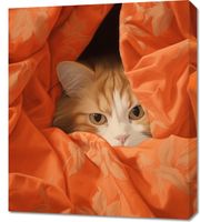 Obraz z serii wnętrza zatytułowany Ukryty Kot. Uroczy kot o miękkim, złoto-rudym futrze spogląda na świat z bezpiecznej kryjówki, otulony w żywo pomarańczową tkaninę z delikatnym wzorem. Jego przenikliwe oczy i ostrożna postawa kontrastują z ciepłymi kolorami materiału, tworząc obraz pełen ciepła i domowego uroku. Ten obraz doskonale oddaje charakterystyczną dla kotów mieszankę niezależności i potrzeby komfortu. Idealny do dodania odrobiny osobowości i uroku w każdym pomieszczeniu, zwłaszcza w przestrzeniach mieszkalnych, gabinetach weterynaryjnych lub sklepach zoologicznych. Jest to również świetny wybór dla miłośników tych tajemniczych i pełnych wdzięku zwierząt.