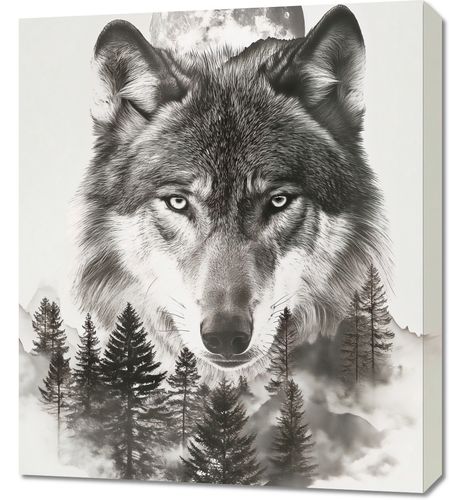 Obraz z serii natura zatytułowany Wilczy Duch Lasu przedstawia majestatyczną głowę wilka, której intensywne, przenikliwe oczy wydają się patrzeć prosto w duszę widza. Tło w odcieniach bieli i szarości tworzy iluzję mgły, która otula sylwetki drzew i zarysy gór. Ponad wilkiem unosi się pełnia księżyca, która rozświetla nocne niebo, dodając kompozycji tajemniczego i mistycznego charakteru. Ten obraz idealnie wpasuje się w przestrzeń miłośnika natury, wzbogacając każde pomieszczenie o element dzikiego i surowego piękna. Dzięki swojej symbolicznej sile i głębi będzie nie tylko dekoracją, ale również źródłem inspiracji i kontemplacji. Idealnie sprawdzi się w salonach, przestrzeniach wspólnych, bibliotekach, a także jako punkt centralny w galerii sztuki czy prywatnym biurze.