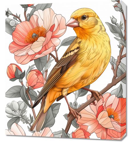 Obraz z serii natura zatytułowany Wiosenny Śpiewaczek przedstawia pełną detali i życia scenę, w której jaskrawo żółty ptak, przypominający kanarka, spoczywa na gałęzi wśród kwitnących kwiatów. Delikatne i subtelne kolory kwiatów w pastelowych odcieniach różu i pomarańczu tworzą miękki kontrast do żywego upierzenia ptaka. Precyzyjne linie i staranne cieniowanie nadają ilustracji realistycznego wyglądu, a roślinność w tle jest równie szczegółowo wykonana, co dodaje kompozycji głębi i bogactwa. Ten obraz to celebracja wiosennego odrodzenia i piękna natury, idealny do ożywienia każdego wnętrza, szczególnie pokoju dziennego, przestrzeni odpoczynkowej lub kawiarni o przytulnej atmosferze.