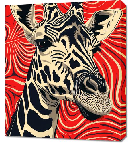 Obraz z serii pop art zatytułowany Wzrok Żyrafy. Grafika ukazuje żyrafę na tle hipnotyzującego wiru w odcieniach czerwieni, który zdaje się pulsować energią i życiem. Wzór tego tła przypomina afrykańskie słońce lub ciepłe prądy powietrza unoszące się nad sawanną. Ciemne, wyraziste kontury żyrafy kontrastują z żywym tłem, akcentując jej unikalne cechy i łagodne spojrzenie. Obraz ten może być inspirującym dodatkiem do każdego wnętrza, szczególnie do przestrzeni urządzonych w duchu przygody lub afrykańskiej estetyki, a także świetnie sprawdzi się jako element edukacyjny w pokojach dziecięcych czy klasach szkolnych.