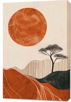 Obraz z serii boho zatytułowany Afrykański Zachód Słońca przedstawia malowniczą scenę z ciepłymi, ziemistymi barwami symbolizującymi niekończącą się pustynię. Wielkie, płonące słońce w kolorze rdzy wisi nad delikatnie zarysowanymi drzewami akacji, które są ikoniczne dla afrykańskiego krajobrazu. Linie konturów wzgórz i pustynnych wydm dodają głębi i perspektywy, a rysunkowe pęknięcia i plamy na słońcu nadają teksturę. Ta kompozycja łączy surowość pustyni z zachwycającym pięknem dzikiej przyrody, idealna dla wnętrz, które pragną odrobiny egzotyki i ciepła afrykańskich barw.