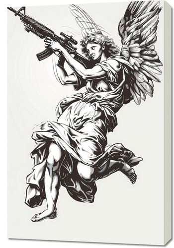 Obraz z serii pop art zatytułowany Anioł Wojny. Przedstawia on postać anioła w klasycznym stylu, jednak z nieoczekiwanym elementem współczesnym – trzyma on broń, co jest zaskakującym połączeniem tradycyjnej symboliki z nowoczesnymi motywami. Ta silna wizualna metafora może prowokować do refleksji na temat konfliktów, pokoju i dwoistości natury ludzkiej. Zastosowanie monochromatycznej kolorystyki wzmacnia dramatyzm kompozycji, a sama praca może stanowić wyrazisty akcent w nowoczesnych przestrzeniach, które cenią sobie głęboką symbolikę i odważne wyraz artystyczny.
