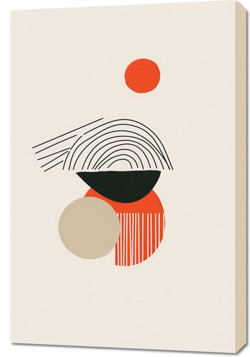 Obraz z serii boho zatytułowany Centralne Słońce to dzieło artystyczne utrzymane w stonowanej palecie kolorystycznej, na którym dominują geometryczne kształty i linie. Na górnej części kompozycji widnieje małe, jaskrawe czerwone koło, które może symbolizować słońce lub inny punkt centralny. Poniżej znajduje się czarna, półokrągła forma z koncentrycznymi liniami, przypominającymi ułożenie naturalnych warstw kamienia lub drzewa. Tuż obok, kontrastujące z nią, znajduje się większe, jasno beżowe koło, które wraz z czarnym półkolem tworzy iluzję przestrzeni. Na dole obrazu uwagę przyciąga większe, okrągłe pole w odcieniu ciepłego pomarańczu, na którym znajduje się wzór pasków w kierunku pionowym, dodający tekstury i ruchu. Całość utrzymana jest w estetyce minimalizmu i modernizmu, gdzie każdy element, choć prosty, jest starannie wyważony, by współgrać z resztą kompozycji.