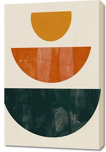 Obraz z serii boho zatytułowany Cykl Natury. Obraz przedstawia trzy przecinające się półkola, ułożone w pionowym szeregu, z których każde posiada unikalną fakturę i paletę barw - od spokojnego, złotego odcienia u góry, przez głęboką pomarańcz z akcentami ciepłej czerwieni pośrodku, do ciemnej, tajemniczej zieleni u dołu. Ta kompozycja wywołuje wrażenie harmonijnego przepływu czasu lub cykli natury. Świetnie sprawdzi się jako dekoracja w nowoczesnych przestrzeniach, takich jak minimalistyczne biura, salony w stylu skandynawskim, a także jako wyrafinowany akcent w strefach wypoczynkowych kawiarni lub butikowych hoteli.