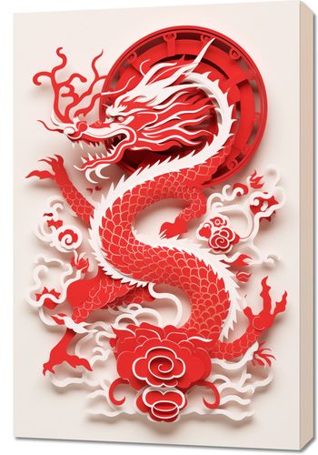 Obraz z serii motywy wschodnie zatytułowany Czerwony Smok. Ta intrygująca grafika przedstawia czerwonego smoka w stylu papierowej wycinanki, który wydaje się wyłaniać z tła z potężną siłą i gracja. Smok, symbolizujący szczęście, siłę i dobrobyt w kulturach azjatyckich, został przedstawiony w pełnym ruchu, z płomieniami i chmurami otaczającymi jego ciało. Kolor czerwony dominuje w dziele, co w kulturze chińskiej jest zwiastunem szczęścia i pomyślności. Ten obraz doskonale nada się jako wyraziste dzieło sztuki w każdym wnętrzu, szczególnie polecany jako dekoracja na święto Chińskiego Nowego Roku, w przestrzeniach publicznych takich jak restauracje czy hotele, a także w domach ceniących azjatycką estetykę i symbolikę.