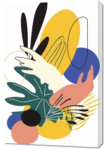 Obraz z serii minimalistyczne zatytułowany Dotyk Tropików. Ten energetyczny i kolorowy obraz przedstawia abstrakcyjną, niemal surrealistyczną wizję tropikalnej roślinności. Wielobarwne kształty łączą się z naturalnymi elementami tworząc efektowną kompozycję, która oddaje bujność i różnorodność tropików. Paleta barw, od głębokiego granatu, poprzez jaskrawy żółty, aż po delikatne pastele, wnosi do wnętrza świeżość i egzotykę.Ten obraz jest idealnym wyborem dla wnętrz, które pragną wnieść żywiołowość i odrobinę egzotyki do codziennej przestrzeni. Doskonale uzupełni jasne i przestronne salony, a także stanie się inspirującym akcentem w kreatywnych pracowniach lub kawiarniach. Może również dodać charakteru nowoczesnym, minimalistycznym biurom, wprowadzając żywe barwy i organiczne motywy.