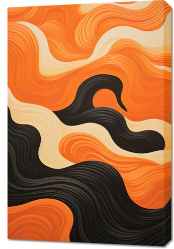 Obraz z serii abstrakcja zatytułowany Dzień spotyka Noc. Falujące wzory przypominają o zachodach słońca na horyzoncie, gdzie słońce zanika za krętą linią nocy. Wzory w odcieniach pomarańczu i złota ścierają się z głęboką czernią, tworząc harmonijną grę świateł i cieni. Te przenikające się kolory dodają obrazowi energii i dynamiki, prowadząc nas przez krajobraz zmieniającego się dnia. Kontrast pomiędzy ciepłymi i chłodnymi tonami przyciąga wzrok i wciąga w głąb kompozycji. Idealny dla nowoczesnych kawiarni, artystycznych przestrzeni oraz domowych salonów pragnących wprowadzić nutę spokoju i refleksji.