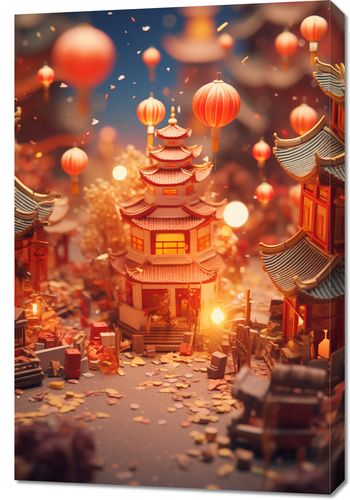 Obraz z serii motywy wschodnie zatytułowany Festiwale Świata. Ta urocza i ciepła kompozycja przedstawia tradycyjny azjatycki dom w sercu starożytnego miasta, rozświetlonego przez setki lampionów unoszących się w powietrzu, co nadaje scenie atmosferę świętowania i radości. Subtelne światło i złote konfetti na pierwszym planie tworzą efekt głębi i magicznego blasku. Obraz ten wprowadza do wnętrza ducha azjatyckiej kultury i jest doskonałym dodatkiem do przestrzeni, które chcą uczcić piękno i tradycję festiwali latarni, takich jak restauracje, salony spa lub jako wyjątkowy akcent w domowych salonach.