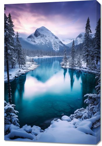 Obraz z serii pejzaże zatytułowany Górzyste Prześwity. Ten obraz ukazuje zachwycający zimowy krajobraz z krystalicznie czystym jeziorem, które odbija lśniące szczyty górskie i pastelowe barwy zachodzącego słońca. Obfite śnieżne pokrywy na drzewach i brzegach jeziora dodają scenie poczucia spokoju i izolacji. Idealny do wnętrz, które chcą wprowadzić elementy spokojnego piękna natury, ten plakat jest doskonałym dodatkiem do przestrzeni mieszkalnych, biurowych lub jako ukojenie w miejscach publicznych, wprowadzając atmosferę wyciszenia i odprężenia.