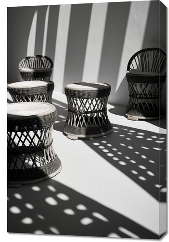 Obraz z serii wnętrza zatytułowany Gra Świateł to stylowa, monochromatyczna fotografia, która oddaje estetykę współczesnego designu. Na fotografii widzimy zestaw eleganckich, plecionych stołków z rattanu ustawionych na tle geometrycznych cieni. Ostre linie cieni przełamują okrągłe kształty mebli, tworząc fascynującą kompozycję pełną kontrastów. Białe siedziska stołków pięknie kontrastują z ciemniejszymi elementami, a gra światła i cienia nadaje scenie trójwymiarowość i teksturę. Obraz ten będzie doskonały dla miłośników minimalistycznych wnętrz, a także dla osób poszukujących elementu dekoracyjnego, który wprowadzi do pomieszczenia nowoczesny i artystyczny akcent. Idealny do nowoczesnych przestrzeni mieszkalnych, biur, kawiarni lub galerii sztuki.