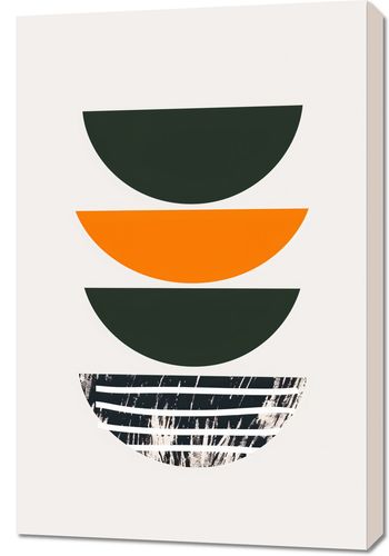 Obraz z serii boho zatytułowany Gra Tekstur to połączenie czystych, geometrycznych form z wyrazistą grą tekstur. Trzy półkoliste kształty w odcieniach głębokiej zieleni i żywej pomarańczy są ułożone w precyzyjny stos, tworząc zaskakującą głębię i zmysłową symetrię. Najniższa forma przerywa ten porządek, wprowadzając do dzieła dynamiczne, surowe detale, przypominające efekt artystycznego, spontanicznego malowania lub drapowania. Ten obraz jest idealnym wyborem dla wnętrz, które doceniają silne, graficzne elementy oraz surowy, industrialny klimat, pasując zarówno do minimalistycznych, jak i bardziej eklektycznych przestrzeni.