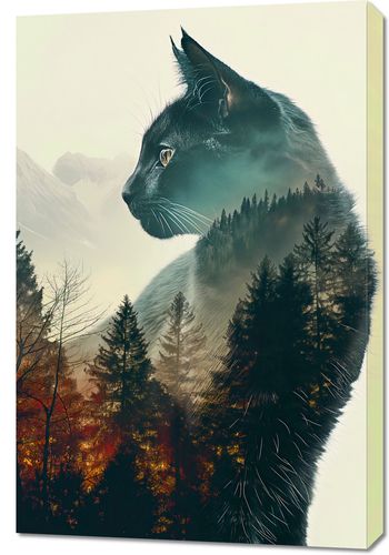 Obraz z serii natura zatytułowany Koci Duch Lasu. Ten obraz prezentuje zaskakującą kompozycję, w której sylwetka czarnego kota płynnie przechodzi w mglisty krajobraz leśny, łącząc świat zwierzęcia z dziką przyrodą. Złote i ciepłe odcienie jesiennego lasu w tle kontrastują z chłodnymi tonami gór, dodając głębi i tajemniczości. Mistyczne połączenie kota z naturą symbolizuje jedność i harmonię między żywymi istotami a otoczeniem, a także podkreśla dziką i niezależną naturę kota. Obraz idealnie nadaje się do przestrzeni mieszkalnych ceniących połączenie sztuki z naturą, takich jak nowoczesne salony, pokoje relaksacyjne lub gabinety, jak również może być inspirującym elementem dekoracyjnym dla gabinetów weterynaryjnych lub przychodni zoologicznych.