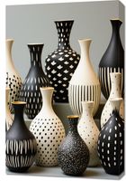 Obraz z serii wnętrza zatytułowany Kontrast i Harmonia. Eleganckie wazony w subtelnych odcieniach bieli i intensywnej czerni stoją dumnie na szarości tła. Geometryczne i abstrakcyjne wzory, które zdobią te wazony, przypominają tętniącą życiem tańczącą symfonię. Kropki, linie i formy tworzą intrygującą kompozycję, która przyciąga wzrok i dodaje wnętrzom wyjątkowej głębi. Subtelna gra świateł i cieni, a także kontrast między monochromatycznymi barwami, dodaje tej kolekcji odrobinę tajemniczości. Będzie to idealne dopełnienie zarówno dla nowoczesnych przestrzeni loftowych, jak i eleganckich salonów z naciskiem na design. Ten wyjątkowy plakat doskonale odnajdzie się w galeriach sztuki oraz w luksusowych hotelach.