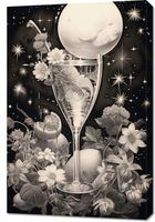 Obraz z serii wnętrza zatytułowany Kosmiczny Eliksir. Niesamowita kompozycja przedstawiająca kieliszek, z którego wylewa się galaktyczny nektar, otoczony kwiatami i roślinami w monochromatycznych barwach. Centralnym punktem jest lśniąca pełnia księżyca, której blask odbija się w szkle, tworząc atmosferę tajemnicy i magii. Gwiazdy migoczą w tle, nadając całości głębokiego, nieskończonego wymiaru. Delikatne linie i szczegóły graficzne wzbogacają kompozycję, czyniąc ją idealnym wyborem do nowoczesnych salonów, galerii sztuki oraz miejsc o tematyce astronomicznej.