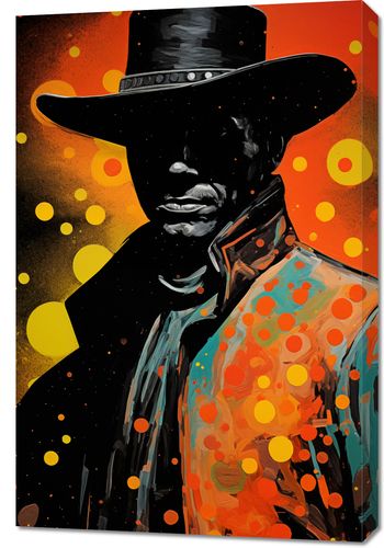 Obraz z serii pop art zatytułowany Kowboj Kosmosu. Ta ilustracja przedstawia postać kowboja, której sylwetka jest zarysowana na tle kosmicznej palety barw z akcentami żywych pomarańczy i ciepłych żółci. Wzór obrazu przypomina współczesną interpretację klasycznych westernowych motywów, połączonych z abstrakcyjnymi, dynamicznymi kształtami i kropkami, przywodzącymi na myśl gwiazdy i galaktyki. Obraz ten jest idealnym wyborem dla miłośników nowoczesnej sztuki oraz tych, którzy cenią sobie odważne połączenie tradycyjnych tematów z nowoczesnym designem, doskonale nadaje się do wnętrz o męskim charakterze, takich jak męskie jaskinie, studia projektowe, a także jako silny wizualny akcent w przestrzeniach publicznych.