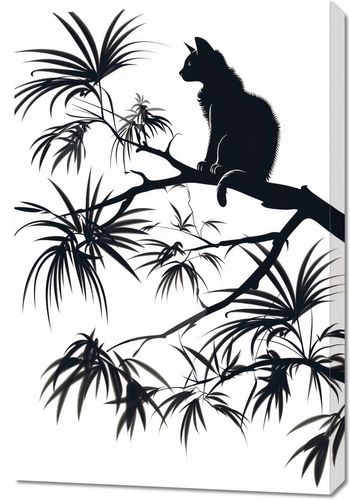Obraz z serii wnętrza zatytułowany Na Gałęzi przedstawia sylwetkę kota siedzącego na gałęzi, zarysowaną na tle jasnego, jednolitego tła. Całość kompozycji utrzymana jest w stylu sumi-e, nawiązującym do tradycyjnej wschodniej techniki tuszem. Kontury kota i roślin są wyraziste, z delikatnymi szczegółami, które przywodzą na myśl efekt cieniowania i głębi. W tle roślinność, prawdopodobnie bambus lub tropikalne palmy, jest przedstawiona w sposób stonowany, co wskazuje na użycie gradientu cieni. Grafika ta oddaje spokój i harmonię, charakterystyczne dla azjatyckiej estetyki i sztuki. Idealnie nadawałaby się jako dekoracja w przestrzeniach inspirowanych minimalizmem i naturą.