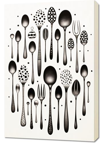 Obraz z serii wnętrza zatytułowany Narzędzia Smaku. Eleganckie sylwetki sztućców w różnorodnych kształtach i wzorach, podkreślane przez subtelne detale i geometryczne punkty, tworzą harmonijną i równocześnie zaskakującą kompozycję. Czarne i białe tony nadają prostotę i wyrafinowanie, podczas gdy unikalne projekty sztućców dodają nuty kreatywności i innowacji. Idealnie sprawdzi się w nowoczesnych kuchniach, restauracjach o minimalistycznym designie oraz w przestrzeniach dedykowanych sztuce kulinarnej.