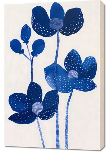 Obraz z serii wnętrza zatytułowany Nocne Kwiaty to odważne, graficzne przedstawienie kwiatów w monochromatycznej palecie kolorów granatowych. Kwiaty o stylizowanych formach i różnorodnych fakturach wyłaniają się na tle w delikatnym odcieniu, co dodaje kompozycji spokojnego, ale zarazem wyrazistego charakteru. Sploty i kropki na płatkach kwiatów tworzą iluzję głębi i tekstury, a ich symetryczny rozmieszczenie nadaje plakatowi rytmicznej harmonii. Ten obraz jest wyrafinowany i współczesny, idealny dla przestrzeni szukających minimalistycznej, ale odważnej dekoracji ściennych, takich jak nowoczesne biura, eleganckie salony czy jako wyjątkowy element w galeriach sztuki.
