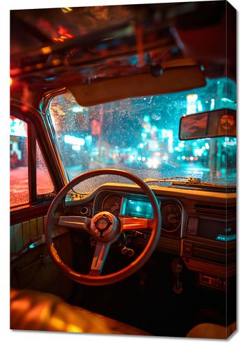 Obraz z serii pop art zatytułowany Nocny Kierowca, przedstawia widok z wnętrza klasycznego samochodu, patrząc przez deszczową, skraplaną szybę na rozświetlone neony miejskiego pejzażu nocą. Ciepłe, czerwone oświetlenie wnętrza samochodu kontrastuje z hipnotyzującym błękitem i elektrycznymi odcieniami świateł zewnętrznych, tworząc intymną, a jednocześnie dynamiczną atmosferę. Kropelki deszczu na szybie dodają tekstury i głębi, sprawiając, że scena jest zarówno realistyczna, jak i liryczna. To dzieło sztuki mogłoby znaleźć swoje miejsce w przestrzeniach nowoczesnych, miejskich loftów lub jako akcent w barze o tematyce retro, wprowadzając element tajemniczości i miejskiego romansu.