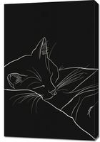 Obraz z serii minimalistyczne zatytułowany Nocny Spokój przedstawia subtelnie zarysowanego kota głęboko pogrążonego we śnie, umieszczonego na tle czarnej, nieskończonej przestrzeni. Białe linie delikatnie kreślą kształt zwierzęcia, uwypuklając jego spokojną postawę i łagodne rysy twarzy. To proste, lecz wyraziste dzieło sztuki przepełnione jest spokojem i elegancją, a kontrastowy czarno-biały motyw przyciąga wzrok i wprowadza do wnętrza atmosferę tajemniczości i wyciszenia. Idealny dla przestrzeni, które są azylem relaksu i odpoczynku, jak sypialnie czy zakątki do medytacji.