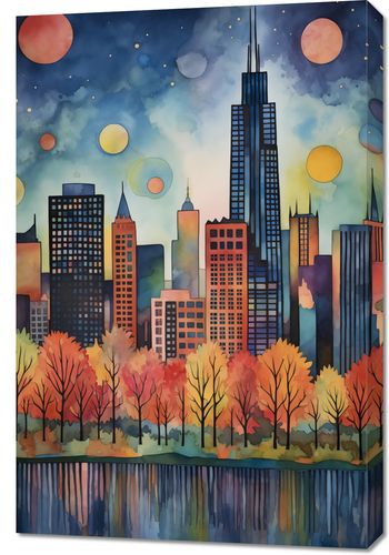 Obraz z serii abstrakcja zatytułowany Panorama Malowniczego Miasta. Ta barwna ilustracja łączy w sobie elementy miejskiej architektury z naturalnym pięknem jesiennej przyrody. Pejzaż miejski z dominującymi wysokimi budynkami kontrastuje z pierwszym planem, na którym widnieją drzewa z liśćmi w odcieniach czerwieni i pomarańczy, co przypomina o cyklicznych zmianach w przyrodzie. Tło z abstrakcyjnie przedstawionym nocnym niebem, rozświetlonym przez delikatne światła i fantastyczne planety, nadaje scenie oniryczny i spokojny charakter. Obraz ten jest idealnym dodatkiem do wnętrz, które pragną połączyć urbanistyczną nowoczesność z łagodzącym wpływem natury.